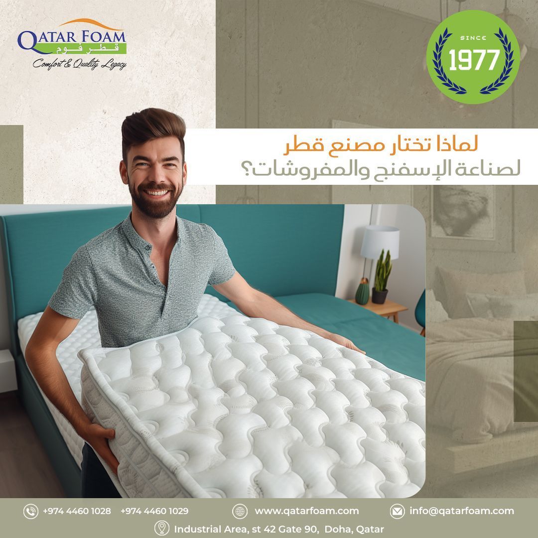 Being the first foam manufacturer in Qatar, we have taken it upon ourselves to deliver everything it means to be the first. It has been 45 years since the factory was founded, 45 years of challenge overcoming, continuous development, and satisfaction delivery. Our march towards excellence will never stop, just like it is for Qatar’s continuous thrive to lead the development. We take our line of expertise seriously. Aiming to specialize in Foam manufacturing exclusively, we have successfully managed to fulfill our purpose by locally producing most demanded Foam products. Our line of production now covers mattresses, pillows, sofas, chairs, Arabian majlis sets, and so much more. Discover more on our Products page.
